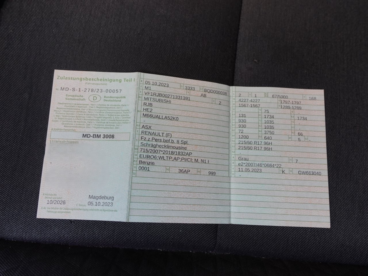 Pkw Mitsubishi ASX, FIN: VF1RJB00271331391, grau mit Firmenbeschriftung, Lieferdienstfahrzeug, Euro6, Benzin, 999 ccm, 67 kW, EZ 05.10.2023, HU 10/2026, km-Stand nicht ablesbar (wird nachgereicht), Einparksensoren vorn und hinten, EFH, elektr. Außenspiegel, Multifunktionslederlenkrad, Tempomat, 6-Gang-Schaltgetriebe, Klima, leichte Verschrammung Frontstoßfänger rechts