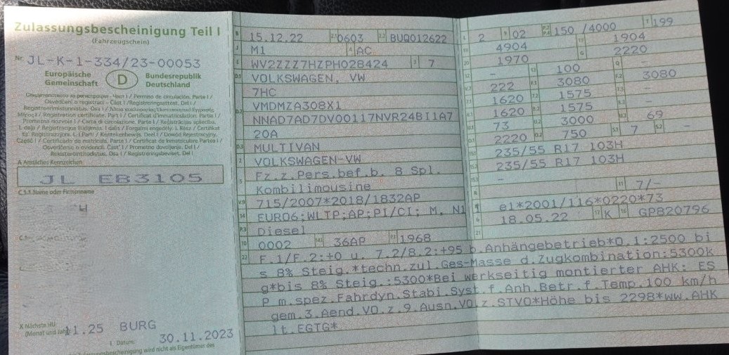 VW T6 Multivan 4Motion, FIN: WV2ZZZ7HZPH028424, Euro6, Diesel, 1968 ccm, 150 kW, EZ 15.12.2022, HU abgelaufen (11.2025), km-Stand lt. Anzeige 81.894 km, abnehmbare Anhängerkupplung, grau, Schiebetüren beidseitig mit Zuziehhilfe, Heckklappe mit Zuziehhilfe, Allradantrieb, Einparksensoren vorn und hinten, LMF 17″ Winterreifen, EFH, elektr. Außenspiegel, ZV, Lichtautomatik, Multifunktionslenkrad, Tempomat, Automatikgetriebe, 3-Zonen-Klimaautomatik, Sitzheizung, Lederausstattung schwarz, Navi, MMI, Cockpit volldigital, 2. Sitzbank 3 Plätze, 2 Einzelsitze ausgebaut vorhanden