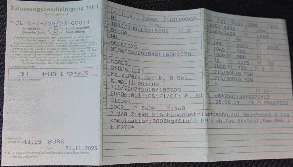 Skoda Karoq, FIN: TWBJJ7NU1L2015282, Euro6, Diesel, 1968 ccm, 110 kW, EZ 14.11.2019, grau, HU abgelaufen (11.2025), km-Stand lt. Anzeige 81.585 km, Einparksensoren vorn und hinten, LMF 18″ Sommerreifen, Satz Winterkompletträder vorhanden, elektr. Heckklappe, EFH, elektr. Außenspiegel, ZV, Lichtautomatik, 6-Gang-Schaltgetriebe, Klimaautomatik, Sitzheizung, Navi, MMI, Textilausstattung