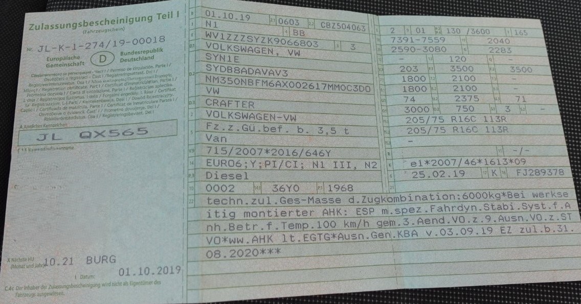 VW Crafter, Hochkasten langer Radstand, FIN: WV1ZZZSYZK9066803, Euro6, Diesel, 1968 ccm, zGg. 3500 kg, EZ 01.10.2019, HU 04.2026, km-Stand lt. Anzeige 143.251 km, Heckflügeltür, EFH, ZV, elektr. Außenspiegel, Multifunktionslenkrad, 6-Gang-Schaltgetriebe, Radio, 3 Sitzplätze, Laderaum mit Trennwand, Klima, Laderaum Holzboden Seitenverkleidung, Verzurranlagen